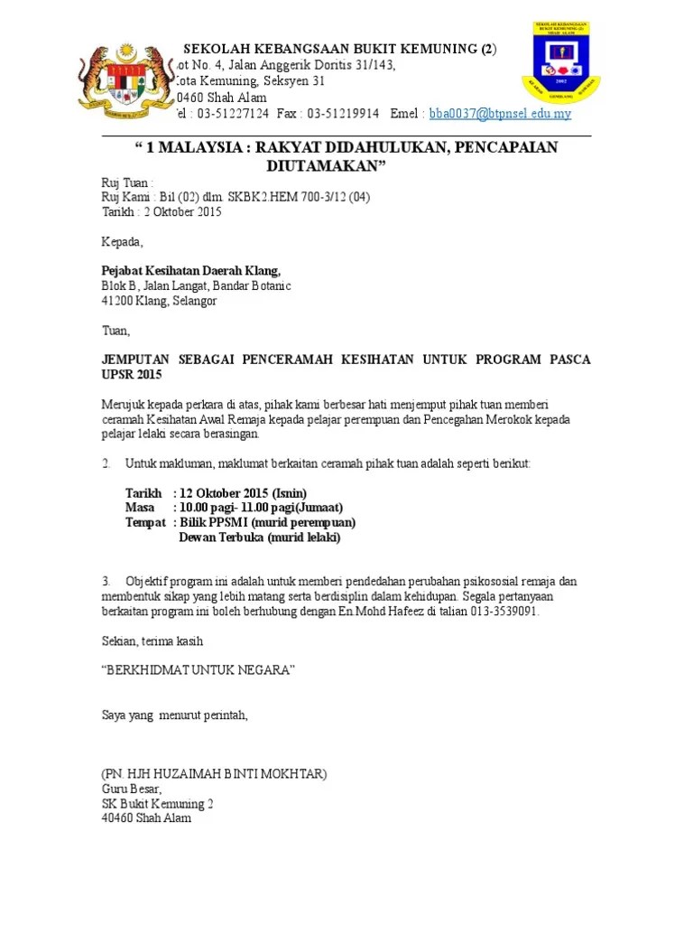 Ketua unit kesihatan sekolah jemputan sebagai penceramah program pendidikan kesihatan pendedahan . Contoh surat jemputan ceramah bomba contoh surat.